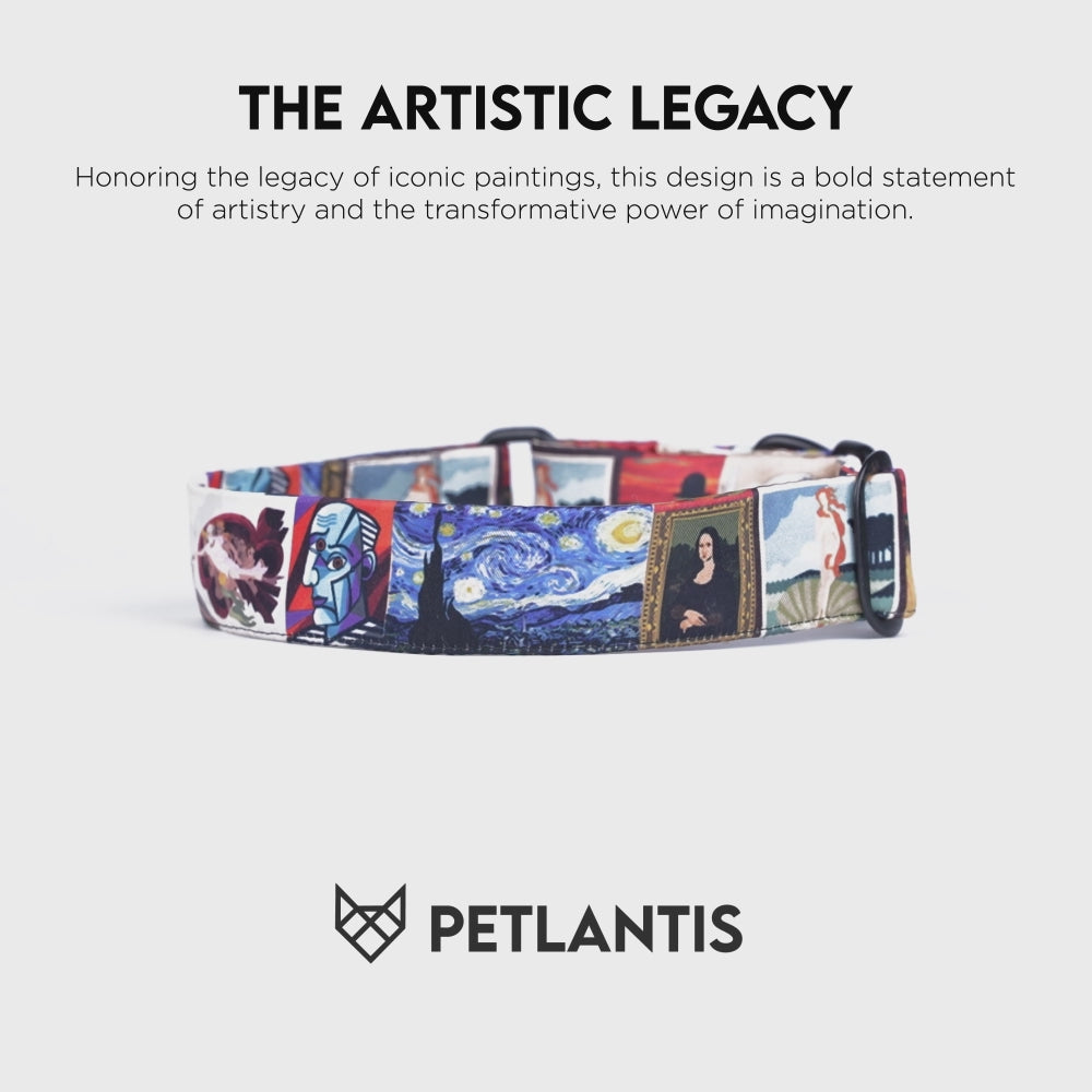 The PETLANTIS Dog Collar in the remarkable Artistic Legacy Design celebrates timeless creativity by featuring an exquisite collage of iconic masterpieces from history’s greatest artists. From Van Gogh’s Starry Night to Da Vinci’s Mona Lisa and Edvard Munch’s The Scream and many more this collar transforms your companion into a living, wagging gallery of art history. Other celebrated works, such as Monet’s serene water lilies and Klimt’s golden The Kiss, add layers of beauty and sophistication to this artistic tribute.