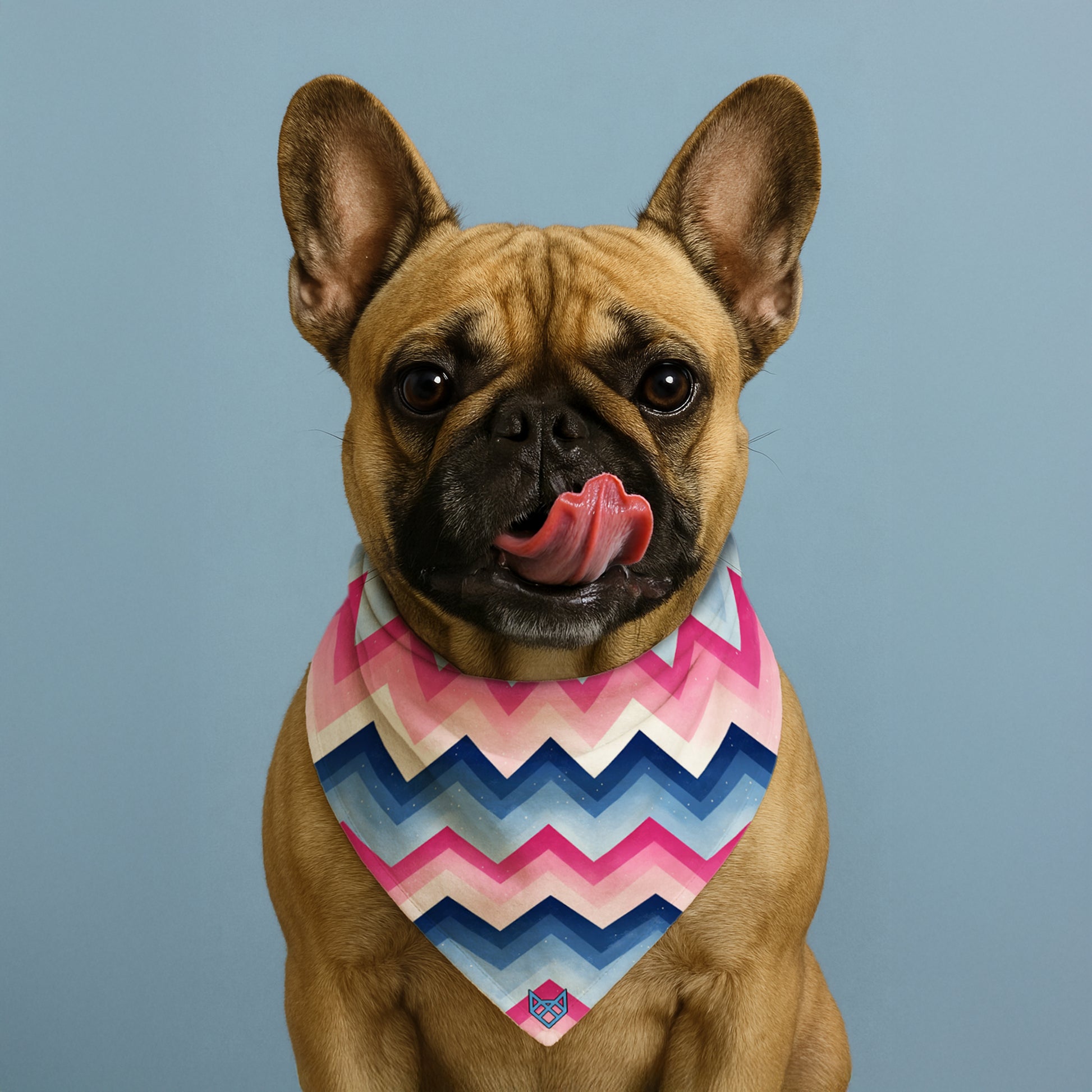Get your pet into the rhythm with The Groove bandana! Featuring a vibrant chevron pattern in pinks, blues, and whites, this bandana brings a playful yet stylish look to any furry friend. Whether your pet is a dog or a cat, the smooth flow of colors captures the energy and fun of a carefree day. Perfect for adding a burst of color to casual outings or special occasions, The Groove ensures your pet stays fashionable and full of personality.
