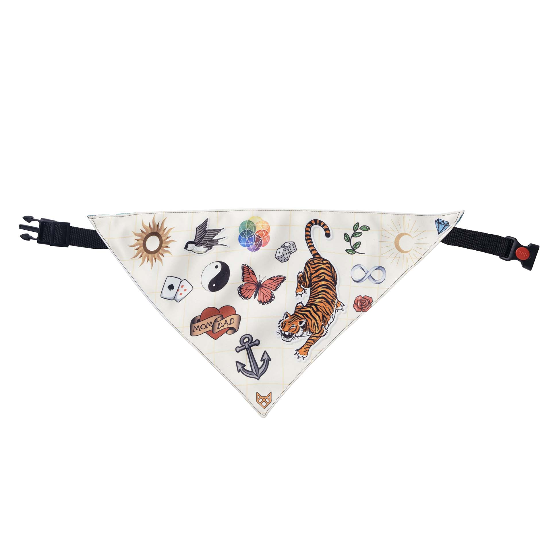Embrace your pet's bold, artistic side with The Inked Soul Bandana. Featuring an eclectic mix of tattoo-inspired designs—like vibrant tigers, hearts, anchors, and symbols of love and infinity—this bandana brings your pet’s personality to life with every detail. Perfect for both dogs and cats, it’s ideal for those who want their pets to wear their hearts on their sleeves... or around their necks!