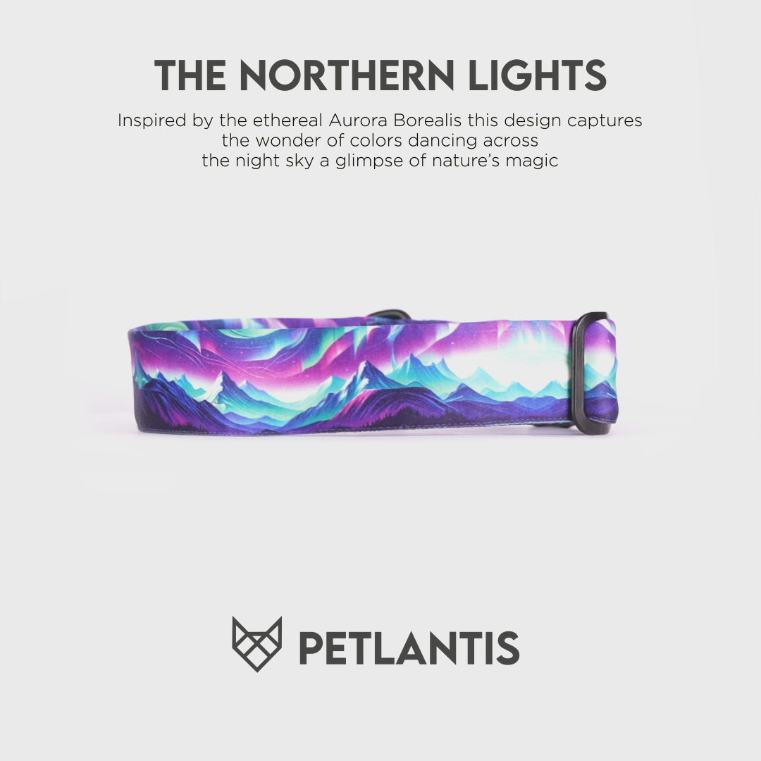 The PETLANTIS Dog Collar in the mesmerizing Northern Lights Design is inspired by the ethereal beauty of the Aurora Borealis. With vibrant hues that dance across the fabric, this collar captures the magic and wonder of the night sky, making it a standout accessory for your companion.