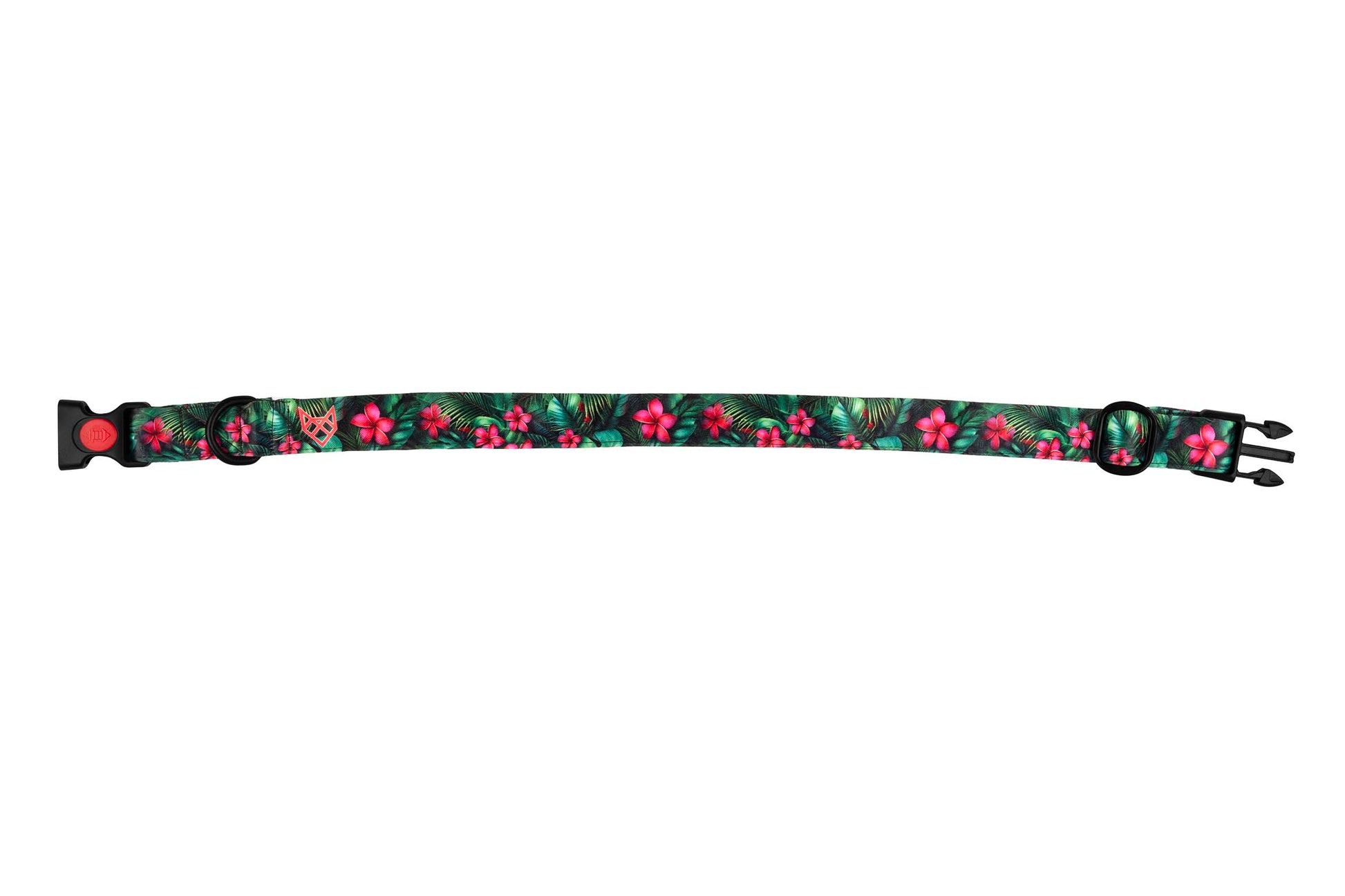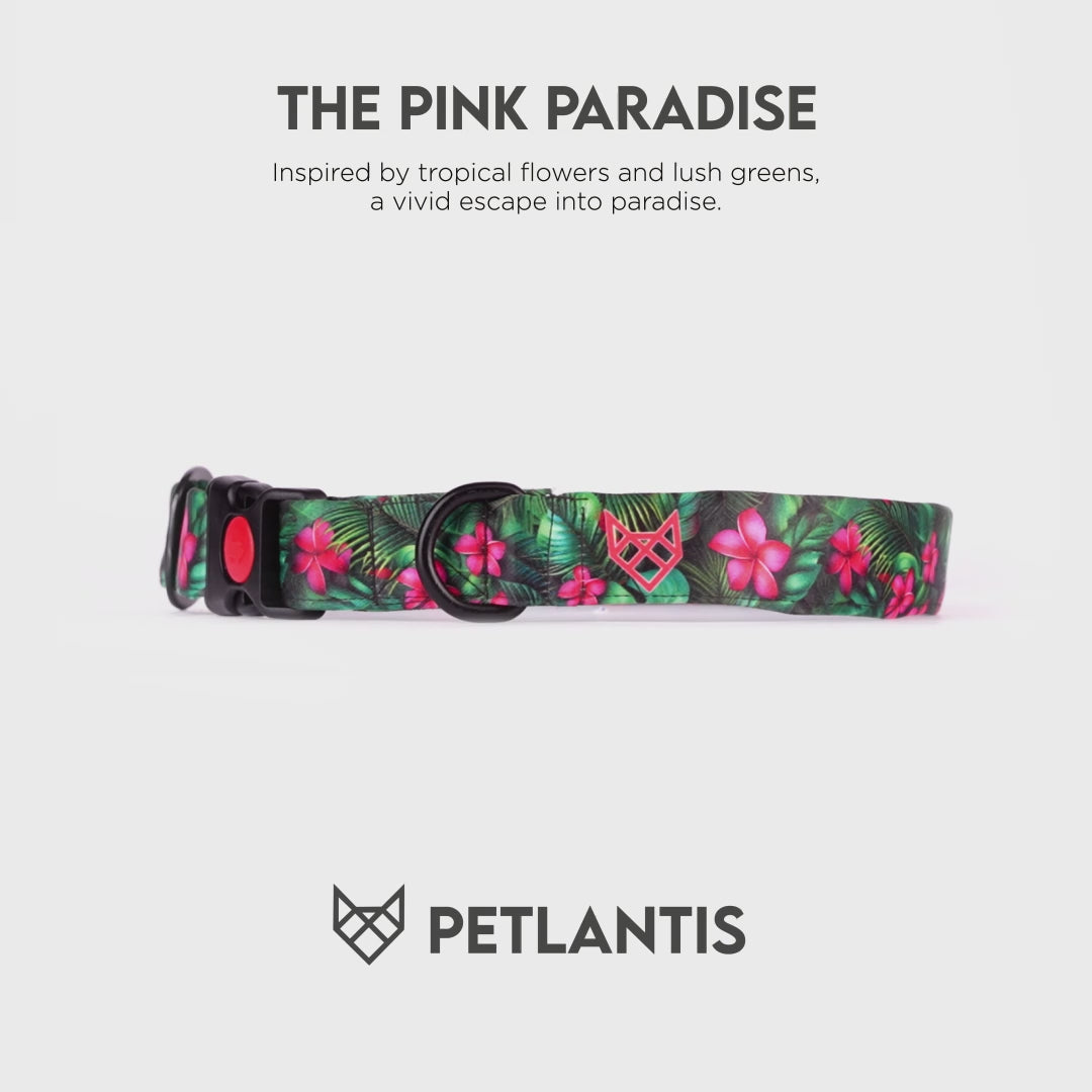 The PETLANTIS Dog Collar in the vibrant Pink Paradise Design is inspired by the lush beauty of tropical blooms and greenery. This stunning design captures the elegance and warmth of paradise, making it the perfect accessory for pets who radiate charm and grace.