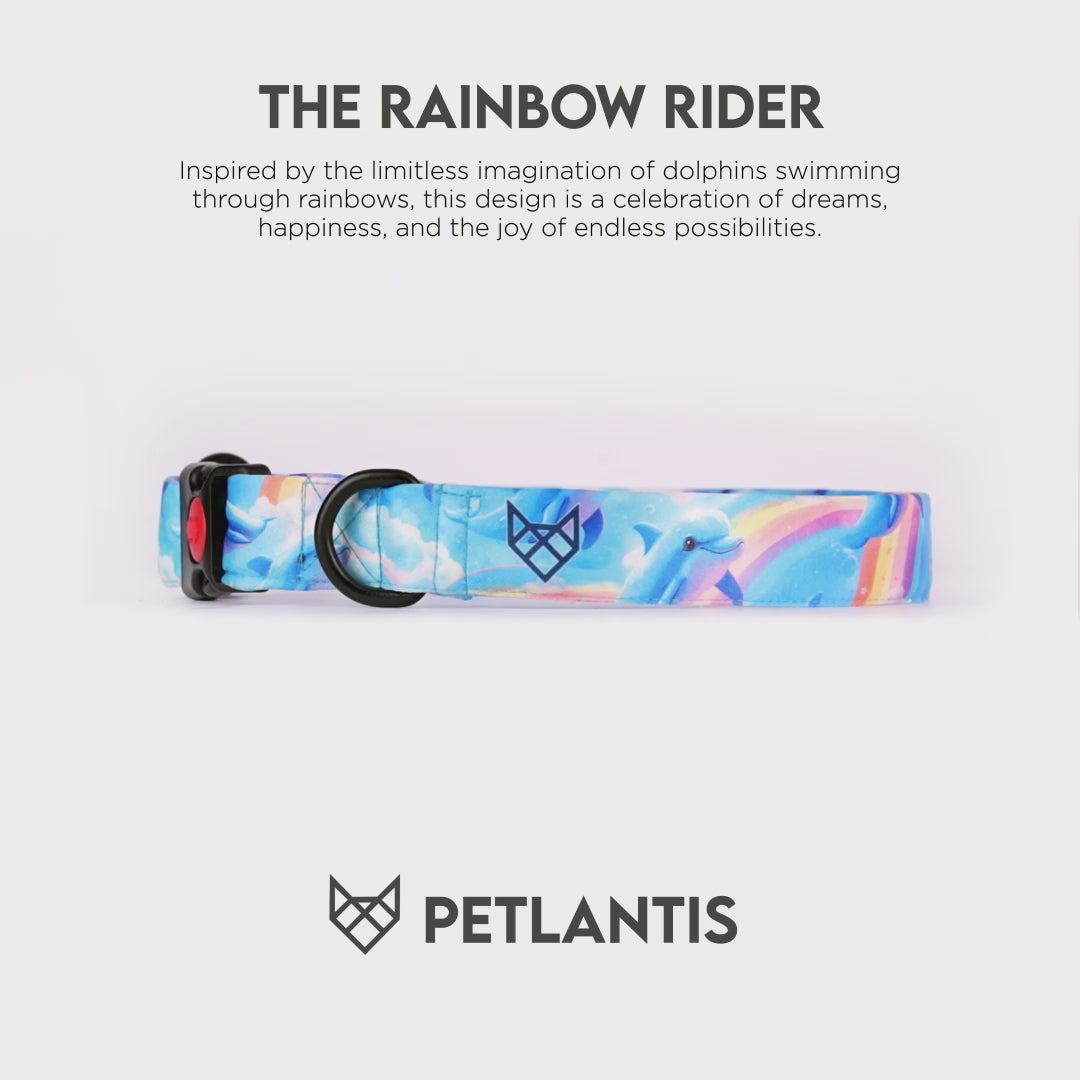 The PETLANTIS Dog Collar in the cheerful Rainbow Rider Design is inspired by the whimsical beauty of rainbows and the playful energy of dolphins. This vibrant design captures the magic of imagination and joy, making it the perfect accessory for pets who brighten every moment.