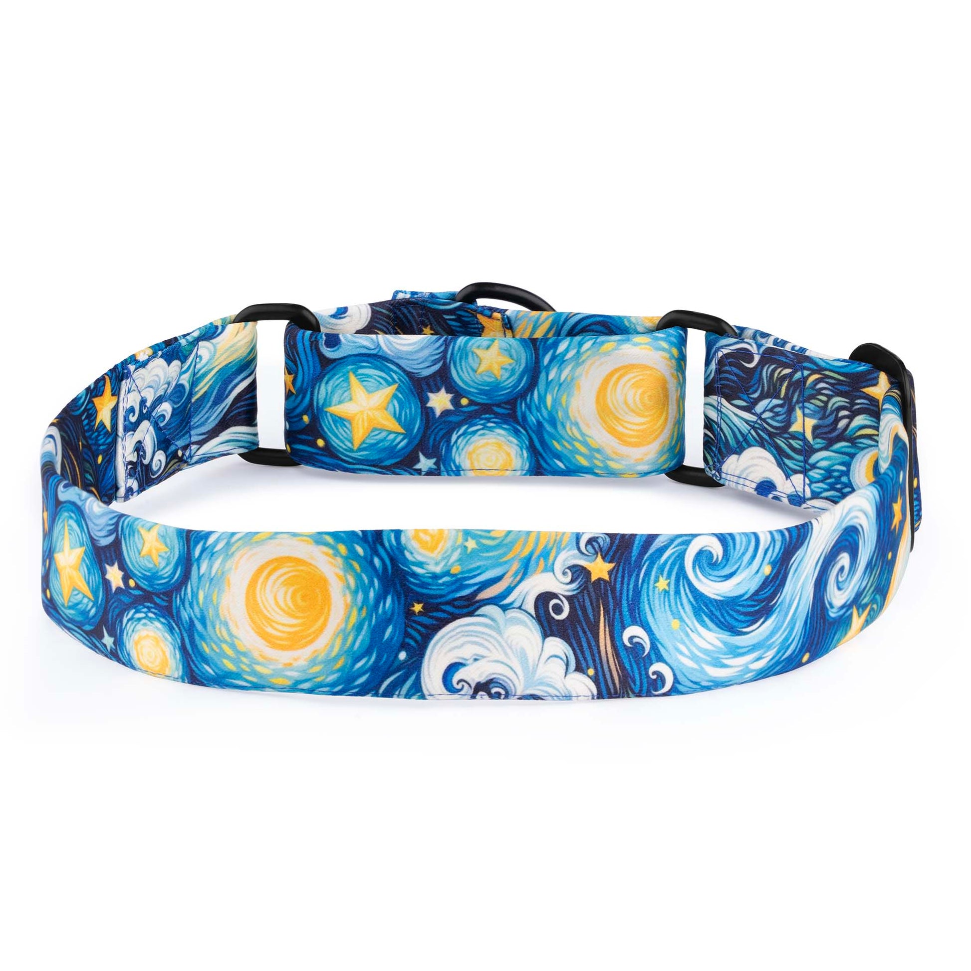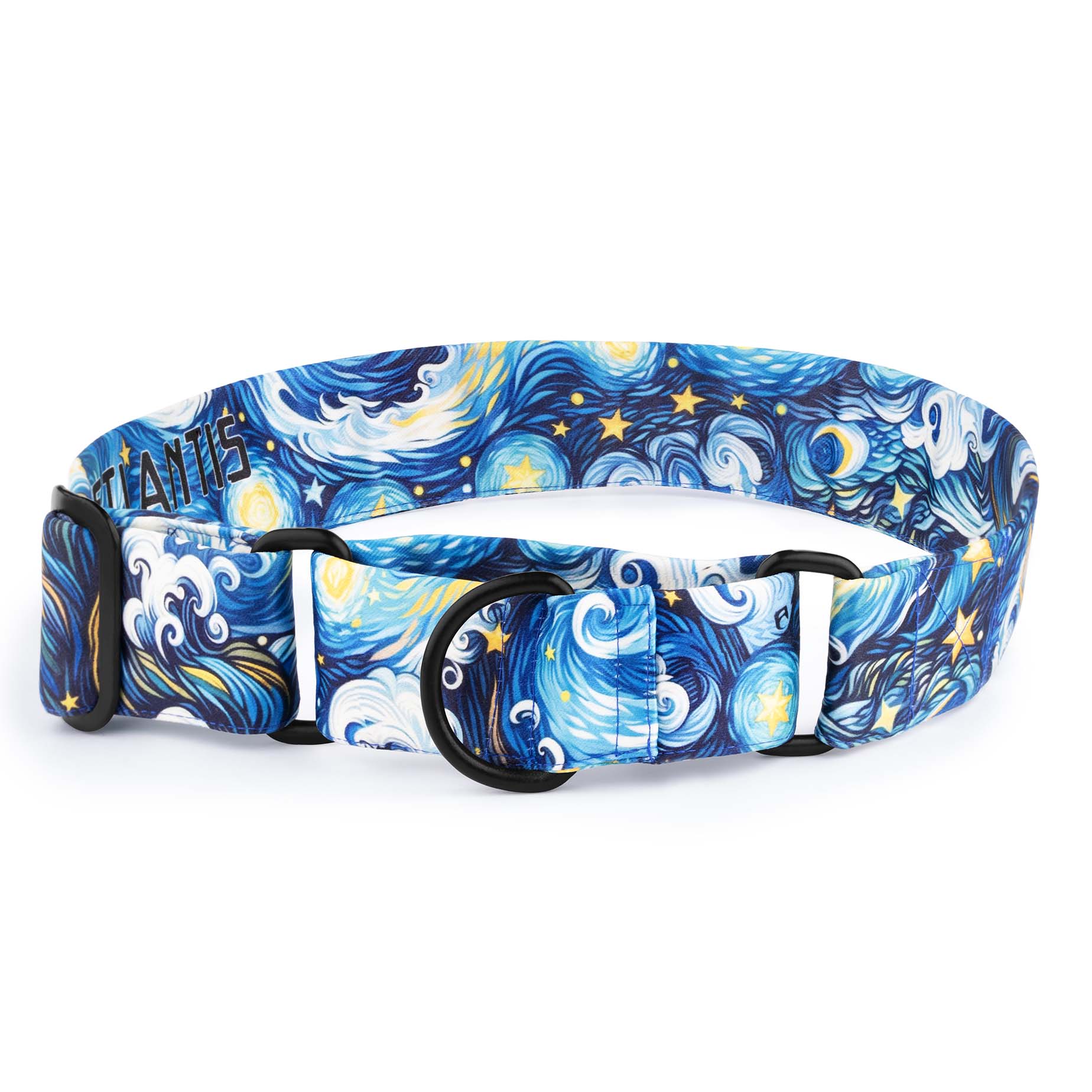 The PETLANTIS Dog Collar in the mesmerizing Starry Nights Design is inspired by Van Gogh’s iconic masterpiece, capturing the swirling skies and radiant stars that symbolize wonder and infinite possibilities. This collar blends artistic beauty with modern functionality, making it a stunning accessory for pets who light up every moment.