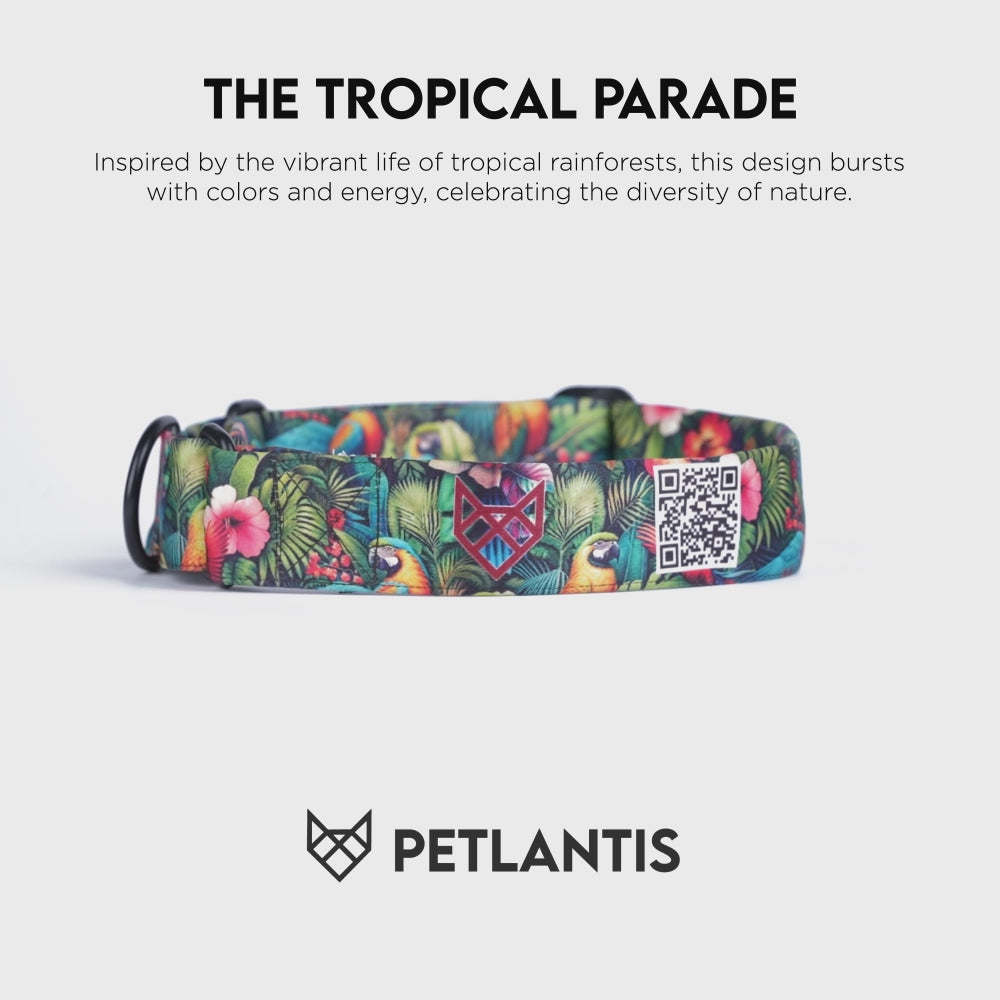 The PETLANTIS Dog Collar in the vibrant Tropical Parade Design is inspired by the lush beauty and lively colors of tropical rainforests. Featuring bold, exotic patterns of tropical birds and flora, this collar captures the energy and diversity of the tropics, making it the perfect accessory for pets who brighten every moment.
